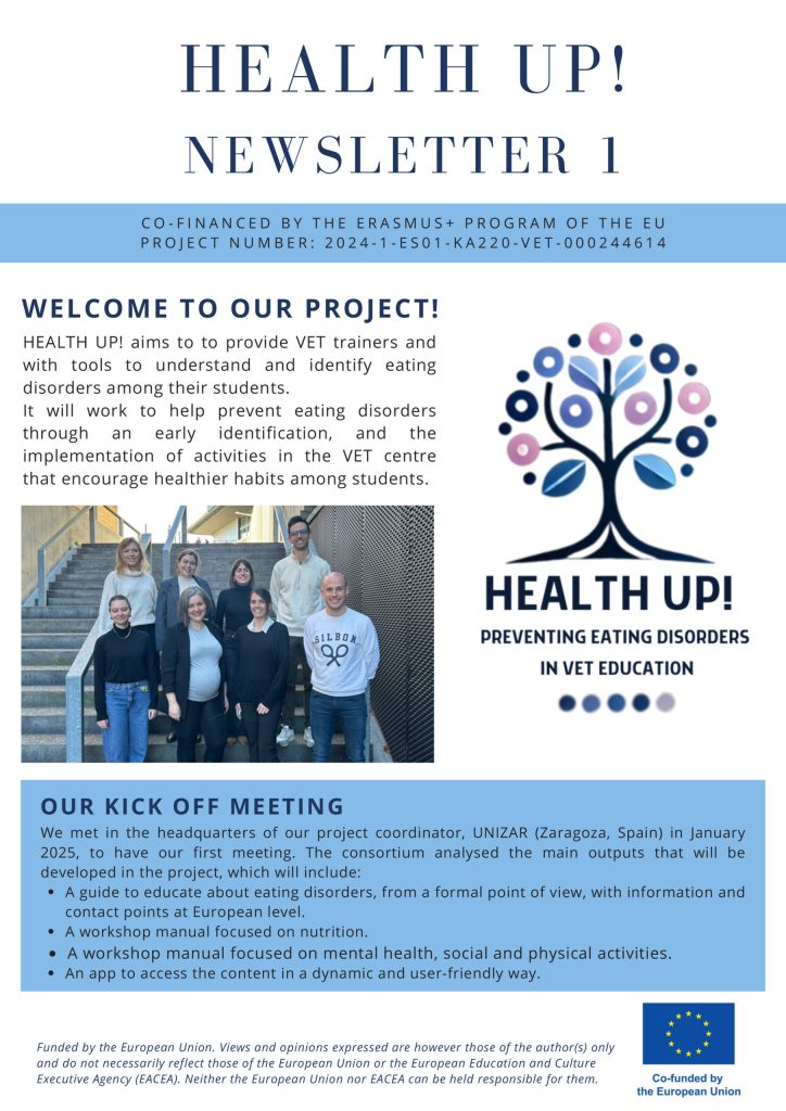 Health Up! Preventing eating disorders in VET education (Project N° 2024-1-ES01-KA220-VET-000244614) has been co-funded by the Erasmus + Programme of the European Union. This website reflects the views only of the author. The European Commission cannot be held responsible for any use which may be made of the information contained therein.